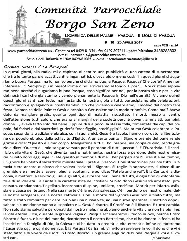 Borgo S. Zeno 23 Maggio 2017 Bollettino di Borgo S. ZenoMontagnana - MerlaraBorgo S. ZenoSCARICA PDF: Borgo San Zeno Viene portato nelle case su iniziativa personali di alcuni parrocchiani. Nei mesi di Luglio e Agosto, uscita mensile. condividi su