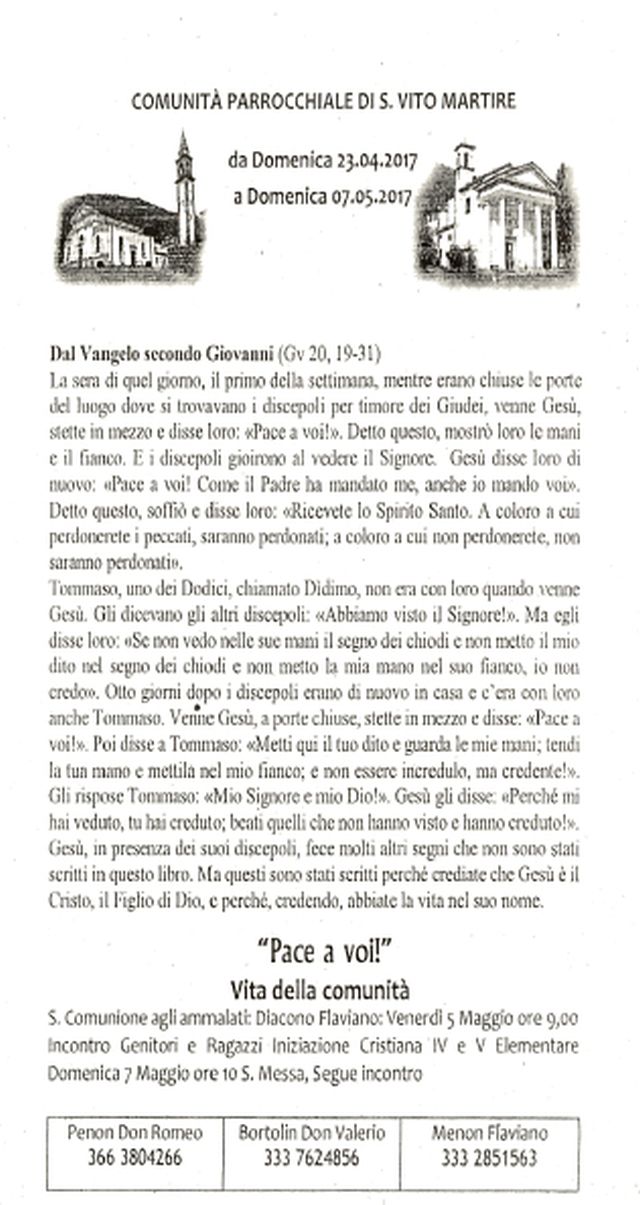 S. Vito di Valdobbiadene 23 Maggio 2017 Bollettino di S. Vito MartireQuero e ValdobbiadeneS. Vito di ValdobbiadeneSCARICA PDF: San Vito Quindicinale di cui 70 al Santuario del Caravaggio e 70 in Chiesa condividi su