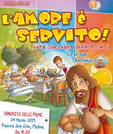 Tavola e tovaglia sono i protagonisti della Festa delle Palme edizione 2013, dal titolo L’amore è servito, che si svolgerà la domenica delle Palme, 24 marzo, alle mattina nelle parrocchie con la preparazione dei rami di ulivo da scambiare e nel pomeriggio, a livello diocesano con l’incontro dei ragazzi e ragazze dell’Acr con il vescovo di Padova, mons. Antonio Mattiazzo. L'appuntamento tradizionalmente organizzato nelle piazze di Padova è stato sospeso a causa delle previsioni meteo e si svolgerà in forma più semplice e contenuta nel teatro dell'Opera della Provvidenza di Sarmeola di Rubano (Pd).