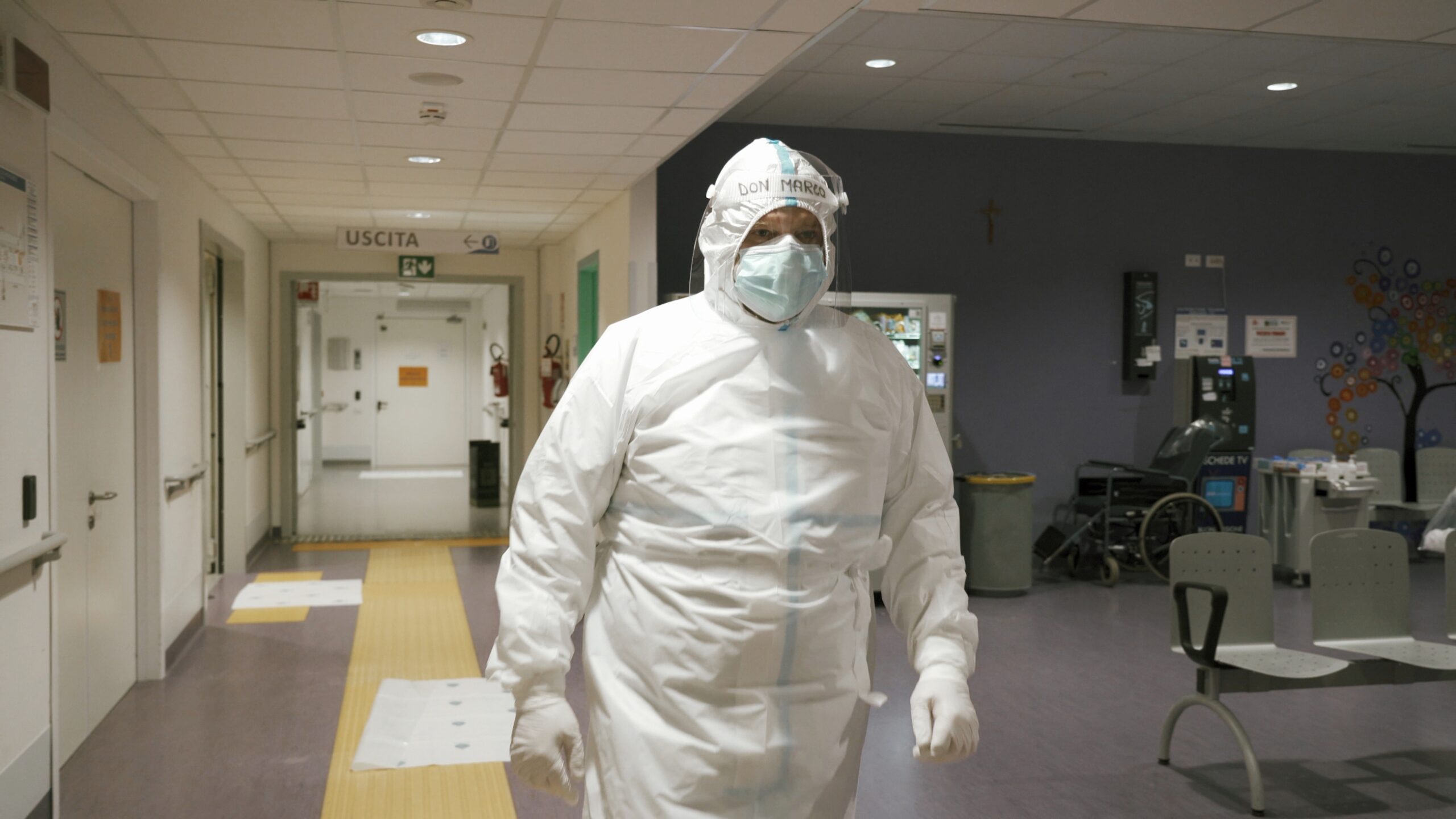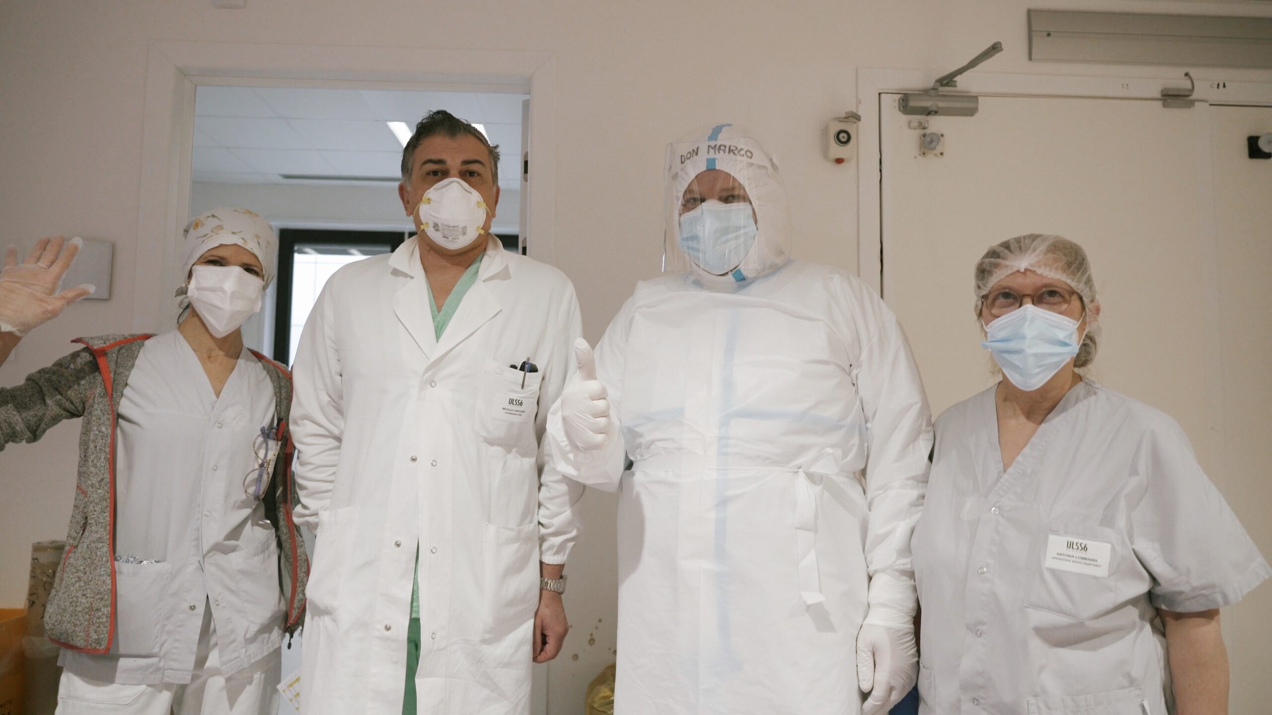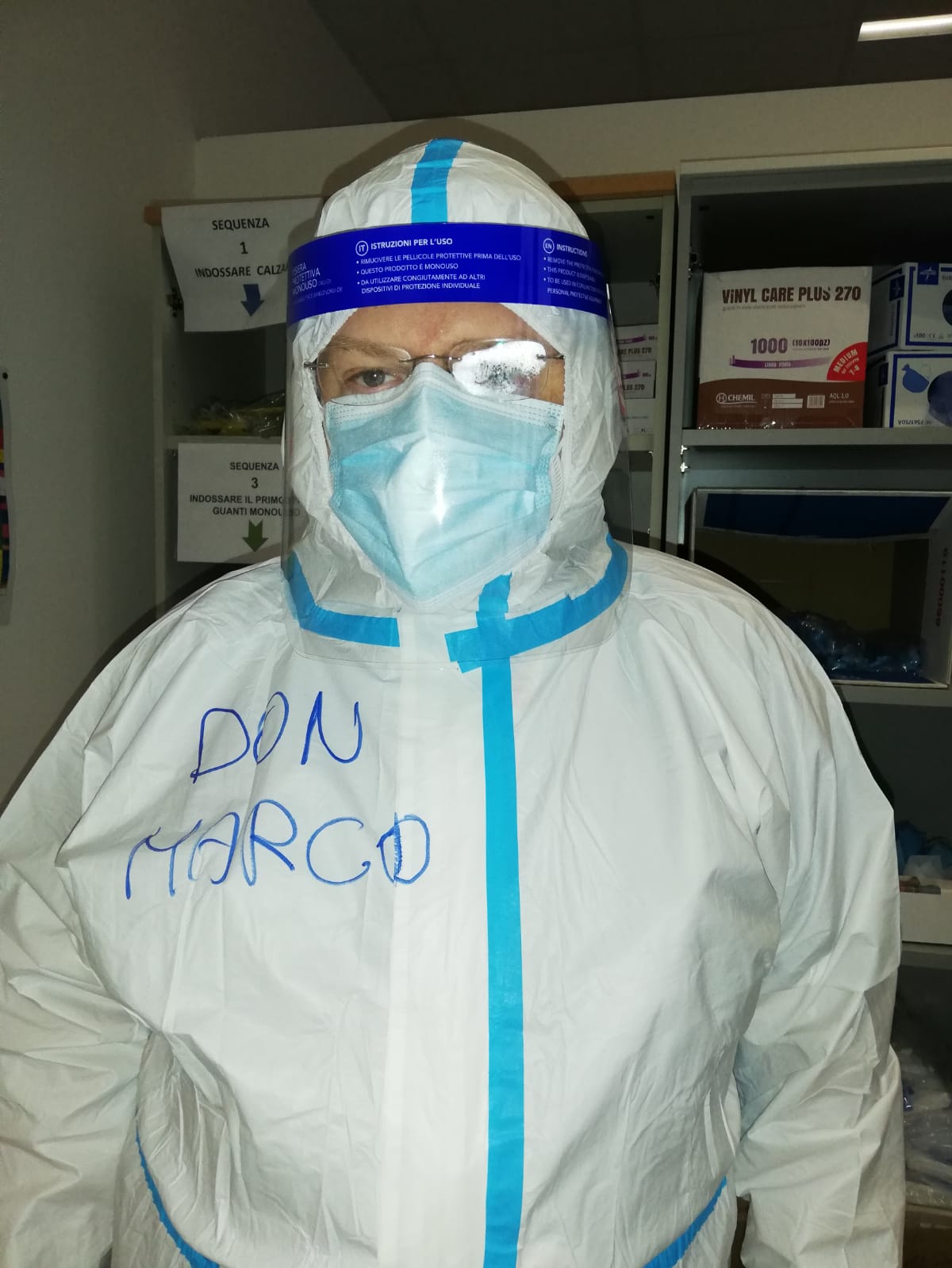 Con il nome scritto con il pennarello sulle tute anti Covid, come medici ed operatori sanitari, don Marco ha vissuto, nel novembre 2020, all’interno dell’ospedale seguendo anche un corso di «vestizione» per apprendere il corretto utilizzo dei dispositivi di protezione in dotazione ai sanitari. Bardato con camice, calzari, cuffietta, visiera, guanti e mascherina ha fatto quotidianamente il giro dei malati colpiti dal virus per portare conforto e fiducia, sostenendo le famiglie di coloro che hanno perso i propri cari.