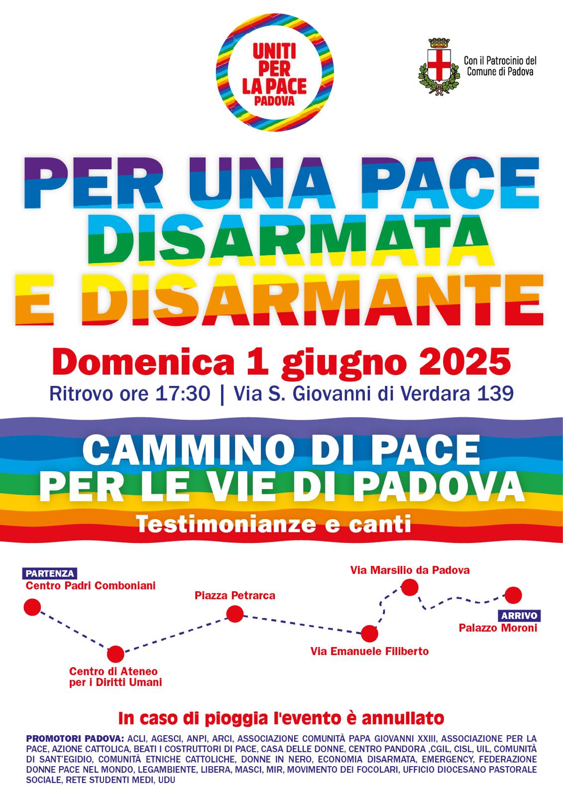 La Chiesa di Padova, che attraverso la Pastorale sociale partecipa all’aggregazione “Uniti per la pace Padova”, promuove la partecipazione al percorso di pace cittadino, dedicato al tema del disarmo come unica possibilità per costruire una pace duratura in tutto il mondo, in programma domenica 1° giugno 2025, con inizio alle ore 17.30 dalla comunità dei Missionari comboniani, in via San Giovanni da Verdara.