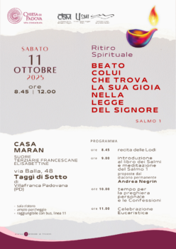 Si danno appuntamento sabato 11 ottobre dalle 8.45 alle 12.00 nella Casa Maran delle Suore Terziarie Francescane Elisabettine a Villafranca Padovana (PD) i consacrati e le consacrate, appartenenti ai vari Istituti e Ordini. della Diocesi di Padova per vivere un tempo di approfondimento spirituale, di comunione fraterna e sintonia con il cammino della nostra Chiesa particolare.
