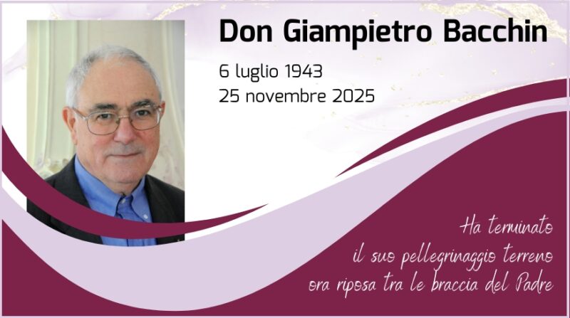 Don Giampietro Bacchin Caltana (S. Maria di Sala, PD), 06.07.1943 – Crosara San Bortolo (Marostica, VI), 25.11.2025 Nel pomeriggio di martedì 25 novembre 2025 il corpo senza vita di don Giampietro è stato ritrovato nella canonica di Crosara San Bortolo, dove risiedeva. Figlio di Gaetano e Ida Patron, era originario di Caltana, dov’era nato il 6 luglio 1943. Ordinato presbitero il 20 aprile 1968, era … Continua a leggere