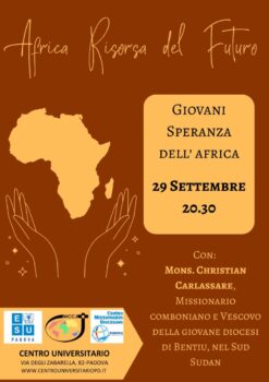 Lunedì 29 settembre alle ore 20.30 il Centro universitario, in via Zabarella 82 a Padova, ospita l’incontro “Giovani speranza dell’Africa”. Ospite mons. Christian Carlassare, comboniano, vescovo della Diocesi di Bentiu nel Sud Sudan. L’appuntamento rientra nel ciclo di incontri “Africa risorsa del futuro” promossi dal Centro universitario in collaborazione con il Centro missionario diocesano, i Missionari comboniani e l’Esu.