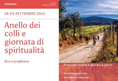 Montegrotto – Battaglia – Monselice – Este – Lozzo – Bastia – Praglia – Abano – Montegrotto – è la ciclovia E2 dei Colli Euganei di Km 62. Quattro ore tranquille di pedalata. Sei con le fermate e il pranzo. Otto con la visita a qualche posto come Este o Monselice. Una semplice bici può realizzare il percorso tranquillamente. Quella con pedalata assistita recuperabile a Montegrotto, aiuta di più. Si percorrerà insieme l’anello e si contempleranno i colli nel loro perimetro, guardandoli continuamente accompagnati da corsi d’acqua.La proposta è di vivere la giornata del sabato in bici, tra una paese e l’altro, con la propria bicicletta o noleggiandola presso un negozio del luogo. Viene chiesto, poi, ai partecipanti di cenare e pernottare presso la casa di spiritualità per poter vivere nella domenica una giornata di spiritualità, fatta di preghiera, di silenzio, di celebrazione dell’eucaristia e anche di confronto. L’esperienza si concluderà con il pranzo della domenica. L’esperienza è indivisa: è fatta di entrambi i giorni in quanto il sabato richiede l’esperienza spirituale della domenica e viceversa.