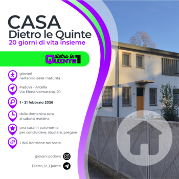 Da domenica 1 a sabato 21 febbraio 2026 a Casa Sant’Andrea in via Guarneri 22 (zono Arcella) a Padova si vivrà un’esperienza di vita insieme tra giovani che stanno vivendo l’anno di maturità. Tre settimane (dalla domenica sera al sabato mattina) con l’obiettivo di condividere la vita quotidiana, studiare sul serio, divertirsi quanto basta, lasciarsi sostenere dal Signore!