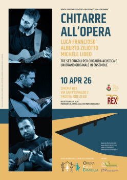 Anche quest’anno un concerto a favore dell’Opera Casa Famiglia di Padova. L’appuntamento è per venerdì 10 aprile 2026 alle ore 21.00 al cinema Rex in via Sant’Osvaldo 2 a Padova con Chitarre all’opera e la partecipazione di Luca Francioso, Alberto Ziliotto e Michele Lideo. Tre chitarristi, tre mondi sonori, un evento unico. Luca Francioso, Alberto Ziliotto e Michele Lideo, esponenti di spicco del panorama chitarristico italiano, porteranno sul palco la loro musica originale per chitarra acustica, eseguita con la tecnica del fingerstyle.