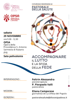 Si tiene sabato 29 novembre dalle 9.30 alle 12.30 all’Opsa, Opera della provvidenza S. Antonio in via della Provvidenza 68 a Sarmaola di Rubano (PD) il convegno diocesano di pastorale della salute dal titolo “Accompagnare il lutto e la sfida della fede“. Ne parlano la psicoterapeuta Alessandra Feltrin, responsabile della psicologia ospedaliera allo Iov-Istituto oncologico veneto, e il pastoralista padre Pierpaolo Valli, camilliano, cappellano all’ospedale Borgo Trento di Verona.
