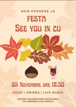 Il Centro universitario di Padova festeggia l’inizio dell’anno accademico con un momento conviviale dal titolo See you in CU mercoledì 5 novembre alle ore 18.30. Nel giardino del Centro universitario in via Zabarella 82 a Padova food, drinks e live music con castagne e vin brulé.