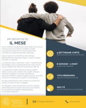 Un’esperienza potente di crescita personale, vita fraterna e approfondimento spirituale. Ciascun giovane si trasferisce per il tempo dell’esperienza negli spazi attigui a Casa S. Andrea (attualmente in via Rossi 2, Rubano) o presso la Canonica del Torresino, zona Prato della Valle.