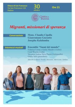 Giovedì 30 ottobre, alle ore 21.00, nella chiesa di San Francesco in via S. Francesco a Padova, il vescovo Claudio Cipolla terrà una “Conversazione” sul tema “Migranti, missionari di speranza”. Dialogherà con don Gianromano Gnesotto, responsabile dell’Ufficio Migrantes della Diocesi e con Josepha Kalalumba, della comunità africana francofona.