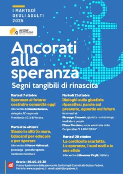 Quarto ed ultimo appuntamento dei “Martedì degli adulti” che quest’anno desiderano approfondire il legame tra speranza e rinascita. Il tema è infatti “Ancorati alla speranza – Segni tangibili di rinascita”.