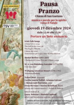 Terzo appuntamento giovedì 19 dicembre con Pausa pranzo. Musica e parole per lo spirito verso il Natale nella chiesa di San Gaetano in via Altinate 73 a Padova. Un’occasione di nutrimento dello spirito, dalle 13.00 alle 13.30, per studenti e lavoratori durante il tempo in cui di solito si va al bar, al ristorante o alla mensa per il pranzo, accompagnati dalla musica e dalle parole proposte dagli allievi del conservatorio C. Pollini e dell’Accademia teatrale Carlo Goldoni.