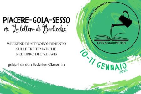 Sabato 10 e domenica 11 gennaio 2026, con inizio alle ore 9.00 del sabato e la conclusione alle ore 15.00 della domenica, sempre a Villa Immacolata a Torreglia (PD) verrà proposto un laboratorio, una possibilità per approfondire delle tematiche prendendo i testi e sviscerando insieme e singolarmente il pensiero di Lewis. Molteplici potrebbero essere i nuclei tematici sui quali ci si potrebbe fermare: l’amore, la fede, la preghiera, il tempo, la libertà, la tentazione. Per quest’anno si è scelto il nucleo del piacere.