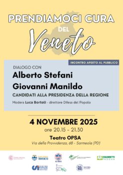 Martedì 4 novembre 2025 alle ore 20.45 in vista del prossimo appuntamento elettorale, le elezioni regionali di fine novembre 2025, al teatro dell’Opera della Provvidenza S. Antonio in via della Provvidenza 68 a Sarmeola di Rubano (PD) si terrà un dialogo con due candidati alla presidenza della Regione Veneto – Alberto Stefani e Giovanni Manildo – dal titolo Prendiamoci cura del Veneto.