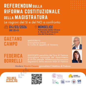 In vista del referendum sulla riforma costituzionale della magistratura del prossimo 22 e 23 marzo 2026, l’Ufficio per la Pastorale sociale della Diocesi di Padova insieme a Fisp – Formazione all’impegno sociale e politico, Masci, Azione cattolica, Ucid e Csi di Padova propone degli incontri conoscitivi delle ragioni del sì e del no.