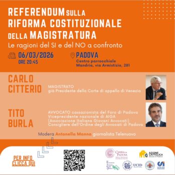 Venerdì 6 marzo 2026 alle ore 20.45 nel centro parrocchiale di Mandria in via Armistizio 281 a Padova si confronteranno il magistrato Carlo Citterio, già presidente della Corte di appello di Venezia e l’avvocato cassazionista Tito Burla, del Foro di Padova, vicepresidente nazionale di AIGA (Associazione Italiana Giovani Avvocati), consigliere dell’Ordine degli Avvocati di Padova. Modera Antonella Manna, giornalista di Telenuovo.
