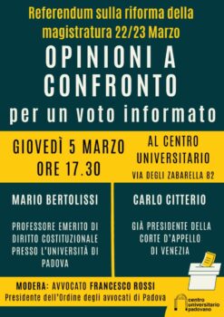 Si tiene giovedì 5 marzo 2026 alle ore 17.00 al Centro universitario in via Zabarella 82 a Padova un incontro sul referendum sulla riforma della magistratura. Intervengono Mario Bertolissi, professore emerito di Diritto costituzionale presso l’Università di Padova e Carlo Citterio, già presidente della Corte d’appello di Venezia. Modera l’avvocato Francesco Rossi, presidente dell’Ordine degli avvocati di Padova.