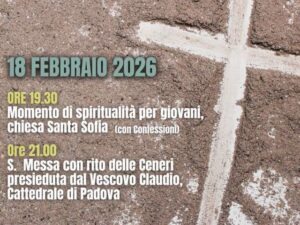 Mercoledì 18 febbraio, mercoledì delle Ceneri, alle ore 19.30 è in programma un ritiro spirituale per giovani dai 18 ai 35 anni. Dopo un momento iniziale di testimonianze, condivisione, riflessione e preghiera (con possibilità di confessione) nella chiesa di Santa Sofia in via Santa Sofia 102 a Padova, alle ore 20.30 si convergerà verso la Cattedrale, dove alle 21.00 il vescovo Claudio presiederà la messa con l’imposizione delle Ceneri.