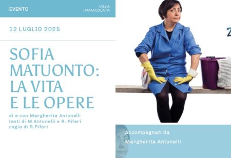 Che dire di Sofia Matuonto, addetta alle pulizie per vocazione, discendente di una dinastia di domestiche, (sua nonna era la domestica di Re Vittorio Emanuele III e della Regina Elena), emigrata a Milano, come dice lei “oramai municipalizzata, da anni e donna assai emanicipata”, persona risoluta , che “non va mai in posti dove non è mai andata” e “sensibbile…”: si emoziona ascoltando ai matrimoni l’Ave Maria di Schumacher, che però “… quando dice dice, ma quando parla parla!” ed esattamente non sappiamo cosa voglia dire. Moglie fedele di Cosimo, la controfigura di Buddha e madre di quattro figli: Katiuscia, Moira, Kristel e Ciro. Sofia in fondo è un po’ quella parte di noi, che è buon senso e tenerezza: la madre rompiballe che vorrebbe vederci sistemati, sposati , ma solo quando vuole lei ; la zia scocciatrice e faccendiera che vediamo volentieri due volte l’anno, la vicina di casa che ci organizza il pianerottolo con le sue piante finte e polverose, la domestica che ci mette a posto la casa, ma delle volte anche i pensieri. Per conoscere da vicino Sofia Matuonto ci diamo appuntamento sabato 12 luglio alle ore 21.30 a Villa Immacolata a Torreglia (PD). Lo spettacolo Sofia Matuonto: la vita e le opere di e con Margherita Antonelli, testi di M. Antonelli e R. Piferi, regia di R. Piferi, vedrà protagonista anche il pubblico.