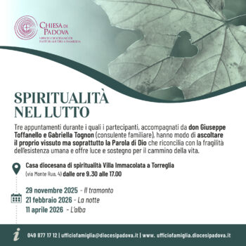 Attraverso l’Ufficio di pastorale della famiglia, la Chiesa di Padova propone lungo l’anno alcuni incontri di spiritualità e condivisione del vissuto per persone che desiderano rivisitare la propria esperienza di lutto per la perdita di una persona cara (coniuge, figlia/o, sorella, fratello, amica/o…) alla luce della Parola di Dio e della Sapienza della Chiesa. È un modo concreto per aiutare “quanti hanno perso una persona cara a riscoprire che hanno ancora una missione da compiere” come sottolineato anche da papa Francesco nell’Esortazione “Amoris laetitia” (255).
