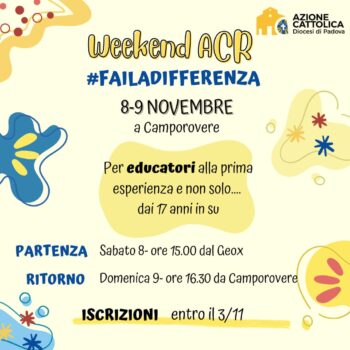Come si inizia ad essere educatori Acr? Come sono arrivato ad intraprendere questa avventura e ha impegnarmi in questo servizio? Ed ora che sono in ballo quanto e come posso metterci del mio in quello che faccio con e per i ragazzi che accompagno? Sono alcune domande che fanno da traccia al weekend #Failadifferenza per fermarsi e riflettere insieme sulla “chiamata” a essere educatori.